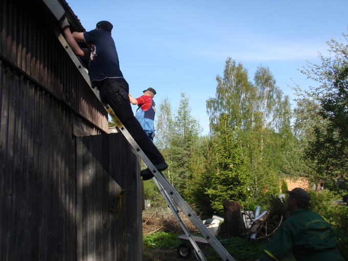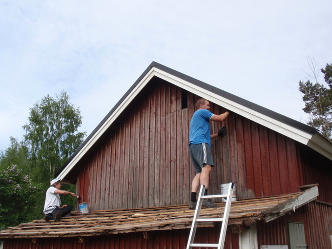 ... Tällä välin tapahtunutta: Matti K. on rapsutellut vanhat maalinrippeet pois... Ja 16.6. alettiin maalaamaan. Tero O. ja Mika aloittivat päädystä... |
