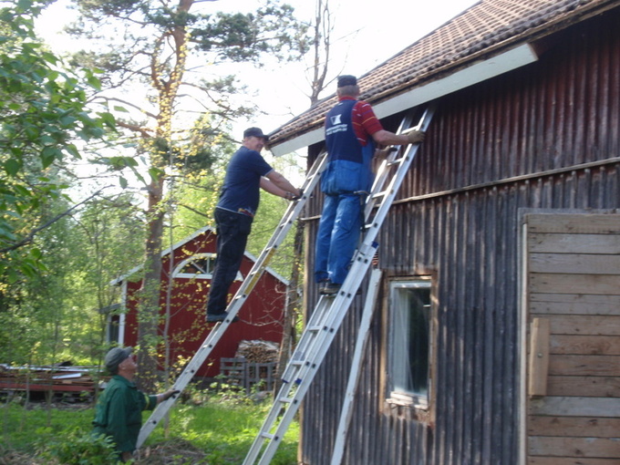 Toukokuussa, ennen maalausta, kohteeseen asennettiin uudet otsalaudat. Vilhon johdolla työntouhussa Matti K., Timo H. ja Jari s. |