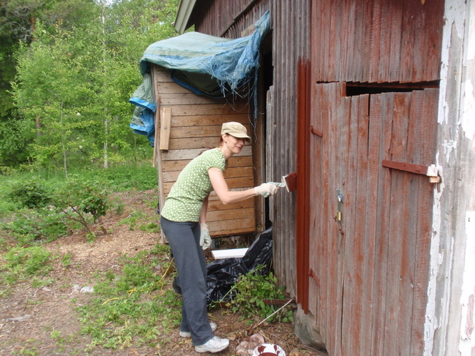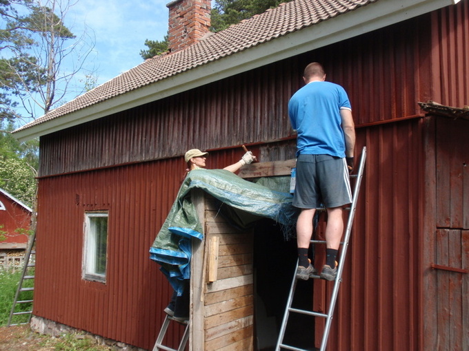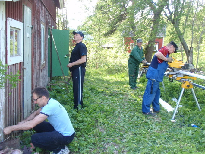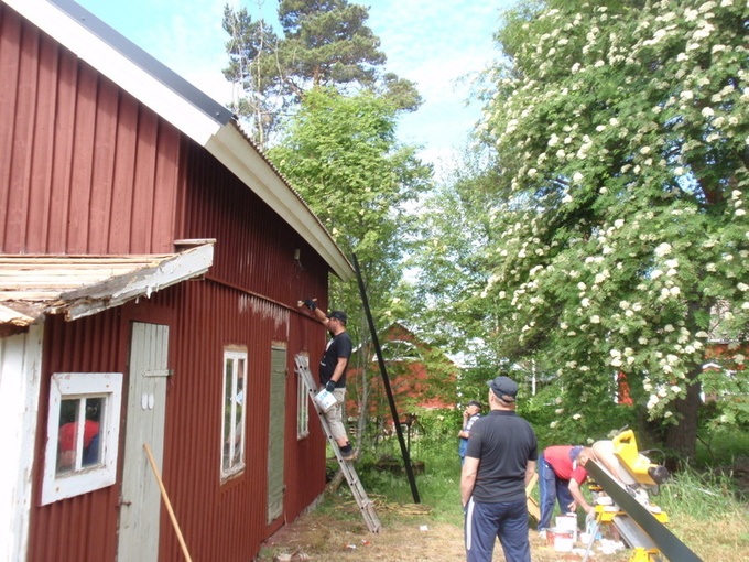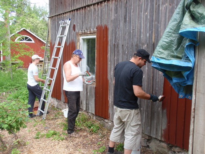 ... Tällä välin tapahtunutta: Matti K. on rapsutellut vanhat maalinrippeet pois... Ja 16.6. alettiin maalaamaan. Tero O. ja Mika aloittivat päädystä... |