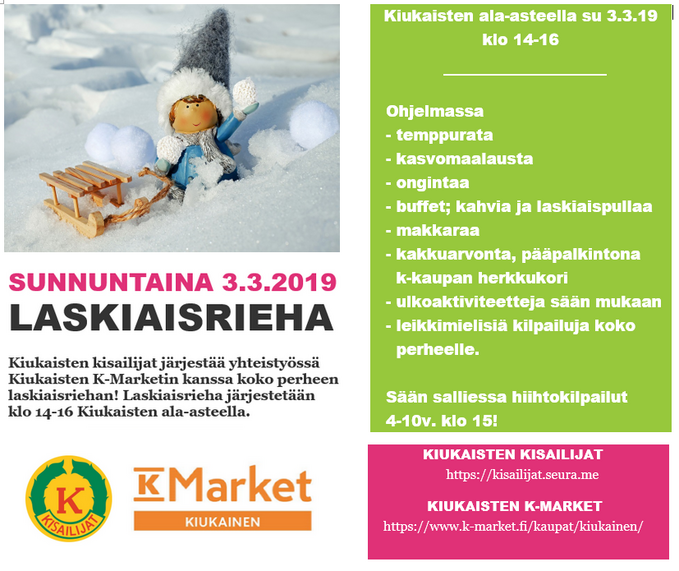 Kiukaisten K-market ja Kisailijat järjestivät koko perheen laskiaisriehan Kiukaisten ala-asteella 3.3.2019. Paikalle saapui suuri joukko lähiseudun lapsia vanhempineen. Ohjelmassa oli mm. ongintaa, mönkkäriajelua ja kasvomaalausta. Koulun liikuntasalin temppuradalla lapsille oli tarjolla sählyä, kiipelyä ja muuta mukavaa puuhaa. Kiitos kaikille mukana olleille.