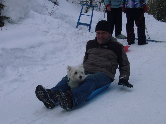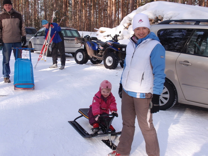 ![]() Pepikin pääsi pulkkailemaan isäntänsä Paavon sylissä. |
