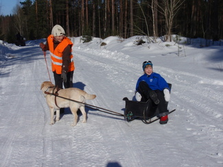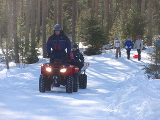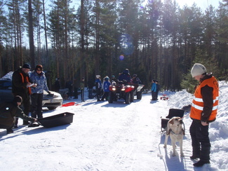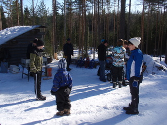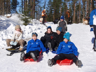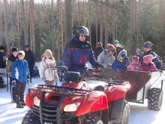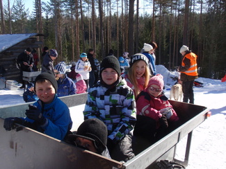 Lapsille oli järjestetty koiravaljakkoajelua ja mönkijäajelua. Satakunnan Noutajakoirayhdistyksen ihanat hauvelit jaksoivat uskollisesti ajeluttaa pienempiä lapsia reessä ja Jannen kyytiin mönkijän peräkärryyn saivat kavuta niin pienet kuin vähän isommatkin lapset ja lapsenmieliset. Pulkkamäessä laskettiin hurjan pitkiä liukuja kelkoilla, liukureilla ja pulkilla ja uskalsipa joku uskalias ison mäen suksillakin alas päästellä! Lumikenkien kantavuutta oli myös mahdollisuus kokeilla lumisessa maastossa.