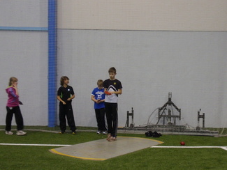 Lasse kiekonheittoharjoituksissa. Kiekon tekniikkaa opetti Suomen kärkiheittäjä Lotta-Kaisa Välkkynen. |