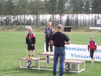 ![]() Punkalaitumen juhannuskisoissa mitalisateessa Kisailijoita. Carita Haapaniemi kultaa ja Esteri Nieminen pronssia. | ![]() Vuoden 2009 piirikunnallisten tyttöjen 9-vuotiaiden korkeuden mitalikolmikko. Carita Haapaniemelle pronssia. |